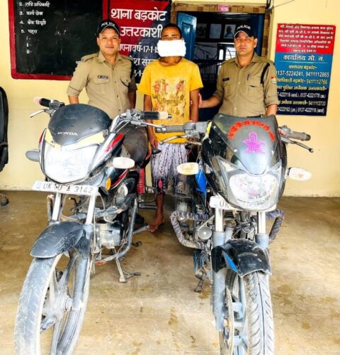 उत्तरकाशी में भास्कर नौटियाल पुत्र श्री धीमा नंद नौटियाल निवासी कुथनोर थाना बड़कोट, पुलिस द्वारा थाने पर आकर किसी अज्ञात व्यक्ति द्वारा घर के बाहर वार्ड नंबर 4 बड़कोट से उनकी मो0सा0 संख्या UK16 C- 5127 (पल्सर) के 15 जुलाई की रात्रि को चोरी कर ले जाने के संबंध में तहरीर दी गयी। तहरीर के आधार पर थाना बड़कोट पर चोरी की धारा में मुकदमा पंजीकृत किया गया, श्रीमान पुलिस अधीक्षक महोदय उत्तरकाशी के निर्देशन में *बड़कोट पुलिस द्वारा बिना समय गवाएं चोरी की गई मोटरसाइकिल की तलाश हेतु क्षेत्र में टीमें भेजी गई। टीम द्वारा चेकिंग तलाशी करते हुए कल सायं को नौगांव जाने वाली रोड स्थित सरूखेत नामक स्थान से विनोद बम ठाकरी पुत्र प्रेम बहादुर बम निवासी ग्राम शीशा पानी गांव, थाना छापलोड़ी, नेपाल हाल निवासी ITI गली बड़कोट, उम्र 27 वर्ष को गिरफ्तार किया गया तथा अभियुक्त के कब्जे से चोरी की हुई मो0सा0 पल्सर नंबर UK16-C-1627 को बरामद किया गया।