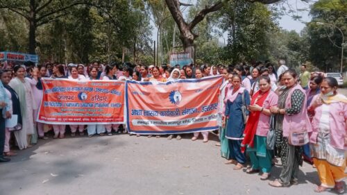 राज्यों की तरह उत्तराखंड राज्य के जनपद हरिद्वार में भी आशा स्वास्थ्य कार्यकत्री महासंघ की जिला महामंत्री श्रीमती सुनीता तिवारी जिला अध्यक्ष श्रीमती गीता पांडे एवं प्रदेश अध्यक्ष श्री संजीव विश्नोई जी श्री हरीश तिवारी जी श्री अनिल राठी जी सभी पदाधिकारियों के साथ समस्त हरिद्वार ब्लॉक के एवं हरिद्वार शहर की जिले की आशाओं द्वारा रोशनाबाद कोर्ट चौक पर एकत्र होकर जिलाधिकारी महोदय कार्यालय तक विशाल रैली निकाली गई एवं जिलाधिकारी महोदय को ज्ञापन दिया गया जिलाधिकारी महोदय के माध्यम से यह ज्ञापन राज्य के मुख्यमंत्री एवं देश के प्रधानमंत्री तक पहुंचाया जाएगा सभी आशा बहनों की मांग प्रमुख मांग है जो इन लोगों को प्रोत्साहन राशि प्रदान किया जाता है वह बहुत समय उपरांत प्रदान किया जाता है उनकी मांगे हैं कि सभी प्रोत्साहन राशि समय पर दी जाए सभी आशा संस्कृतियों को पोलियो का पैसा जो काफी समय से बढा है नहीं किया उसको अब बढा कर दिया जाए रिटायरमेंट बेनिफिट के रूप में ₹500000 एकमुश्त रकम दी जाए प्रधानमंत्री श्रम योगी लाभार्थी उम्र जो पूर्व 18 से 40 वर्ष है उसको बढ़ाकर 18 से 60 वर्ष की आ जाए सभी को एक्टिवा लोन प्रदान किया जाए योग्यता अनुसार सभी को एनम की ट्रेनिंग देकर उनको प्रमोट किया जाए सभी आशाओं का इंश्योरेंस ₹500000 का बीमा किया जाए एवं कम से कम भुगतान ₹18000 प्रति माह निर्धारित किया जाए के अलावा अन्य कई मांगों का ज्ञापन जिलाधिकारी महोदय के द्वारा प्रधानमंत्री जी एवं मुख्यमंत्री जी को प्रेषित किया गया रैली में, श्रीमती सुनीता राणा रोशनी श्री सविता राणा नीतू चौहान राजकुमारी जी किरण, निम्मी मीनाक्षी इन सभी के अलावा हजारों की संख्या में सभी आशा स्वास्थ्य कार्यकत्री बहने एकत्र होकर अपनी एकता का परिचय दिया