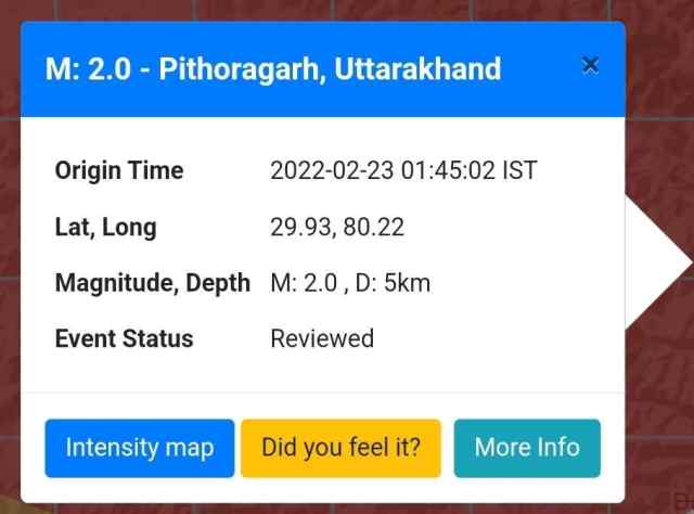 पिथौरागढ़ : उत्तराखंड के विभिन्न क्षेत्रों में लगातार भूकंप के झटके महसूस किए जा रहे हैं। सीमांत जिले पिथौरागढ़ में बीते देर रात 1 बजकर 45 मिनट पर भूकंप के झटके महसूस किए गए। रिक्टर स्केल पर भूकंप की तीव्रता 2.0 मापी गई है। इस महीने में यह दूसरा भूकंप है, जबकि इससे पहले जनवरी में भी प्रदेश में 04 बार भूकंप आया। हालांकि इनसे कुछ जानमाल की हानि नहीं हुई, लेकिन बार-बार भूकंप के झटकों से लोगों में दहशत का माहोल जरूर है।
