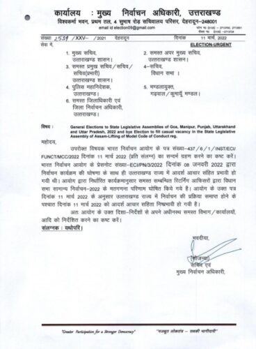 आयोग की ओर से निर्धारित कार्यक्रमानुसार समस्त सम्बन्धित रिटर्निंग आफिसरों की ओर से विधानसभा सामान्य निर्वाचन-2022 के मतगणना परिणाम घोषित होने के बाद आदर्श आचार संहिता निष्प्रभावी हो गयी है
