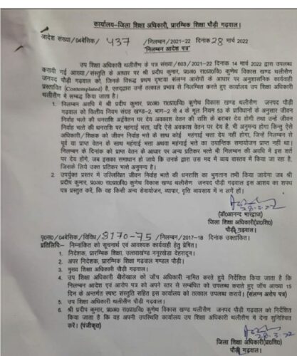 1. निलम्बन अवधि में प्रदीप कुमार, प्र.अ. रा.प्रा.वि. कुणेथ विकास खण्ड थलीसैण जनपद पौड़ी गढ़वाल को वित्तीय नियम संग्रह खण्ड-2, भाग-2 से 4 के मूल नियम 53 के प्राविधानों के अनुसार जीवन निर्वाह भत्ते की धनराशि अद्ववेतन पर देय अवकाश वेतन की राशि के बराबर देय होगी तथा उन्हें जीवन निर्वाह भत्ते की धनराशि पर महंगाई भत्ता, यदि ऐसे अवकाश वेतन पर देय है भी अनुमन्य होगा किन्तु ऐसे अधिकारी/शिक्षक को जीवन निर्वाह भत्ते के साथ कोई महंगाई भत्ता देय नहीं होगा, जिन्हें निलम्बन से पूर्व या प्राप्त वेतन के साथ महंगाई भत्ता अथवा महंगाई भत्ते का उपान्तिक समायोजन प्राप्त नहीं था। निलम्बन के दिनांक को प्राप्त वेतन के आधार पर अन्य प्रतिकर भत्ते भी निलम्बन की अवधि में इस शर्त पर देय होंगे, जब इसका समाधान हो जाये कि उनके द्वारा उस मद में व्यय वास्तव में किया जा रहा है, जिसके लिये उक्त प्रतिकर भत्ते अनुमन्य है।